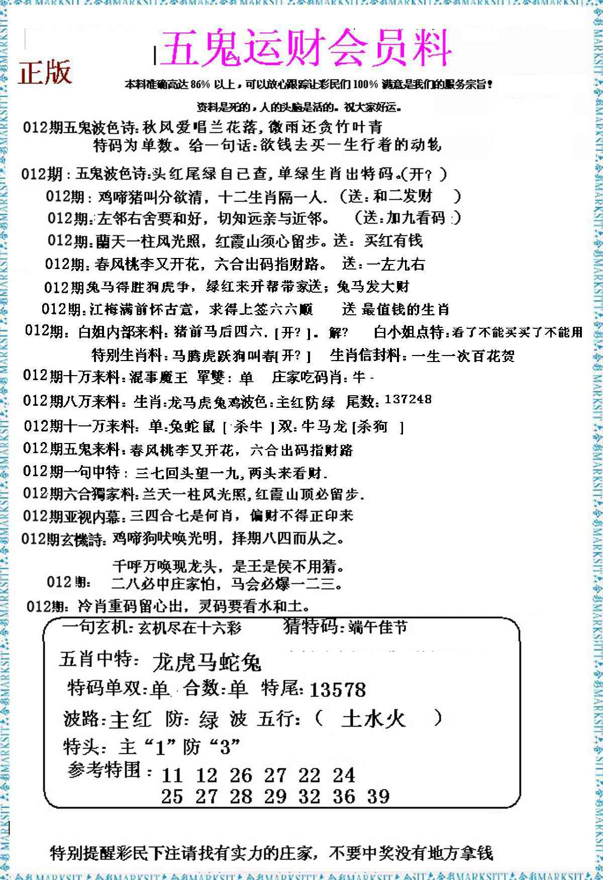 012期五鬼运财会员料[图]