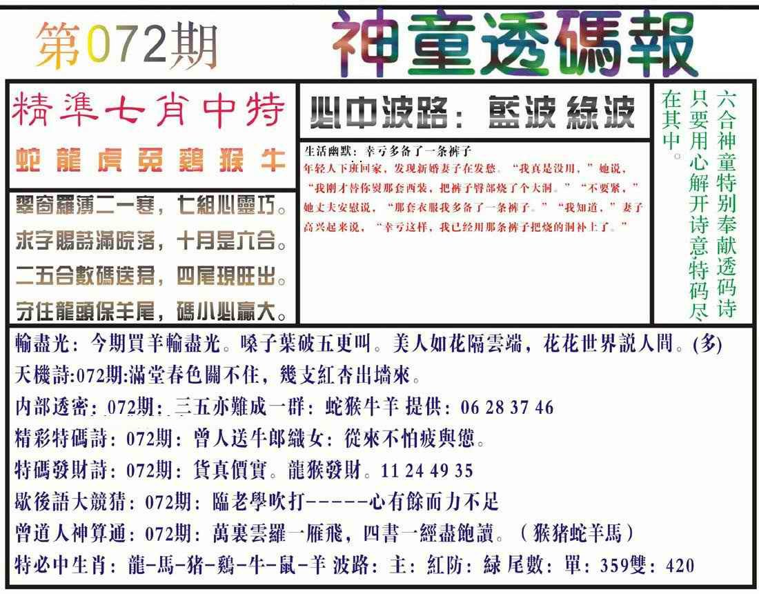 072期神童透码报(正版)[图]