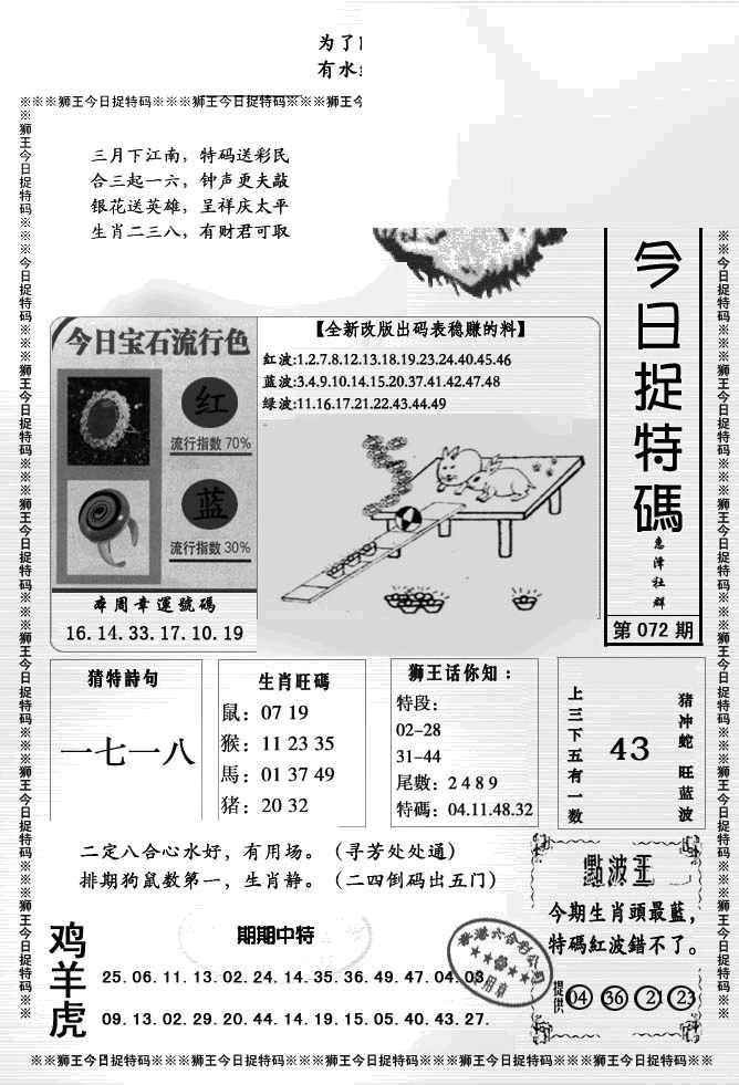 072期狮王今日抓特码[图]